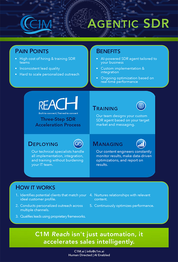 Download one or all of our helpful infographics about AI. Select from 10 Questions About AI That Every CEO Should Be Asking, AI Empowering Service Firms, AI Confusion: A No-Nonsense Guide, The Building Blocks of AI Maturity, and/or Agentic SDR to take the first step in identifying your company’s AI readiness.