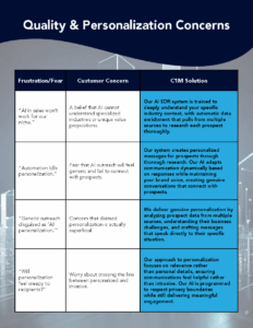 We want you to be 100% confident in the capabilities of the C1M Agentic SDR. To address any fears, we created a comprehensive matrix of common concerns and questions along with the C1M solution for each.